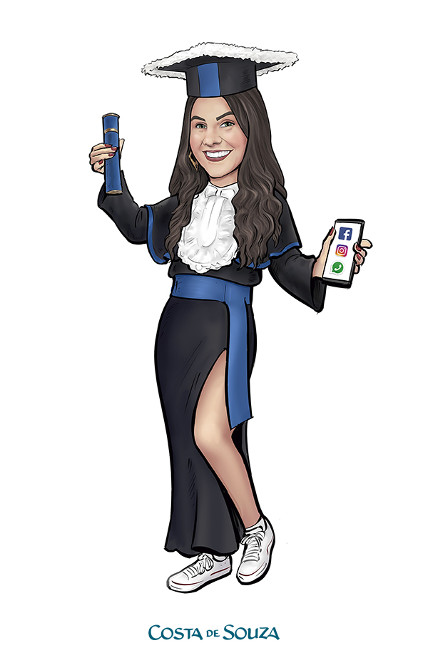 Caricatura por encomenda para formatura em Marketing Digital. A formanda pediu que no desenho aparecesse seu celular com os ícones do Facebook, Instagram e Whatsapp.
