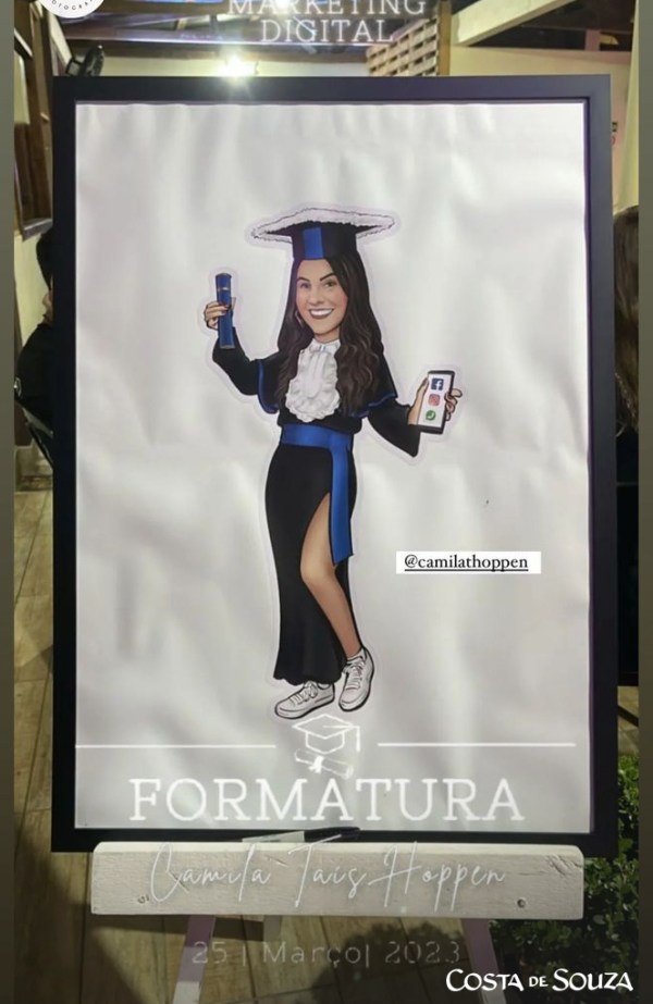 Commissioned caricature for a Digital Marketing school graduation. The graduate asked me to include her cell phone in the picture, with the logos of Facebook, Instagram and Whatsapp.