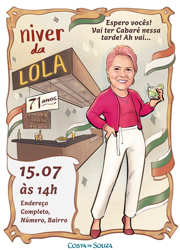 Caricatura e design de convite para aniversário de 71 anos com tema Boteco. Encomenda na opção Colorida, Completa.