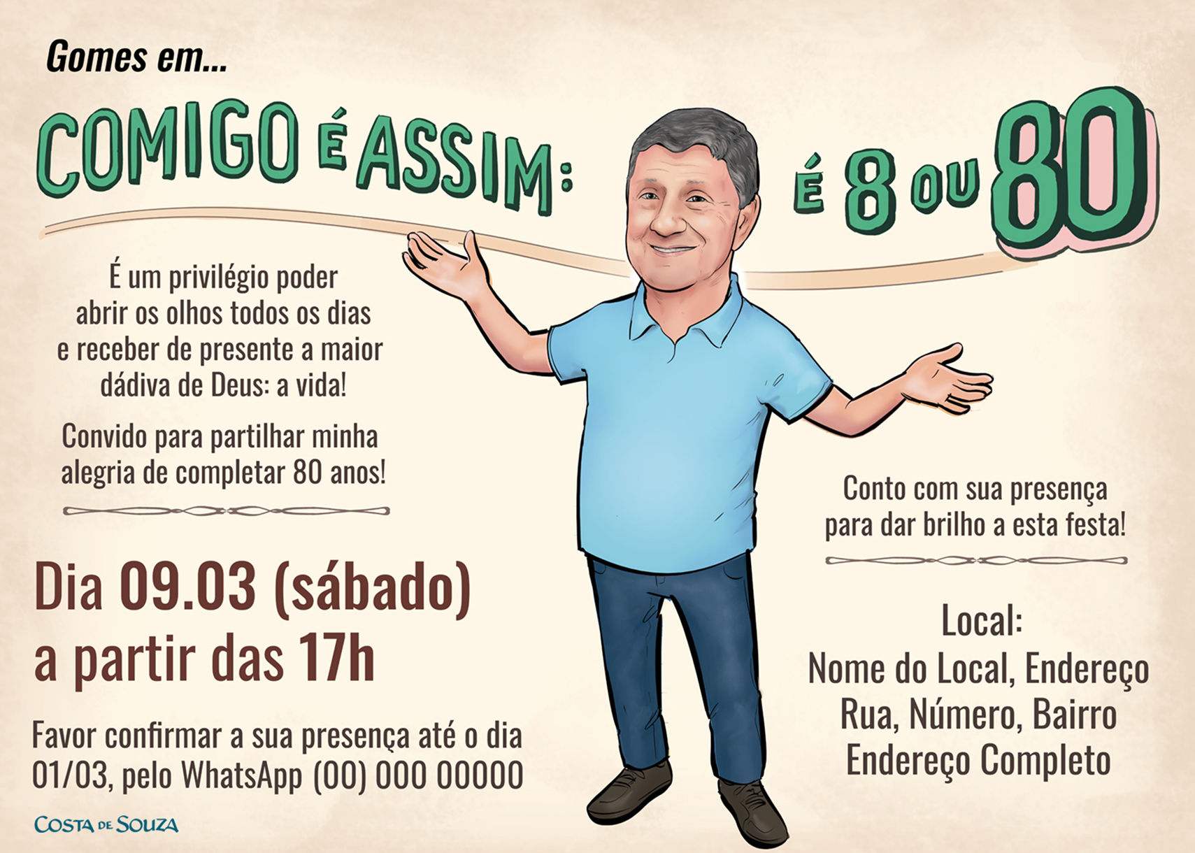 Caricatura e design de convite para aniversário de 80 anos. Encomenda na opção Colorida, completa.