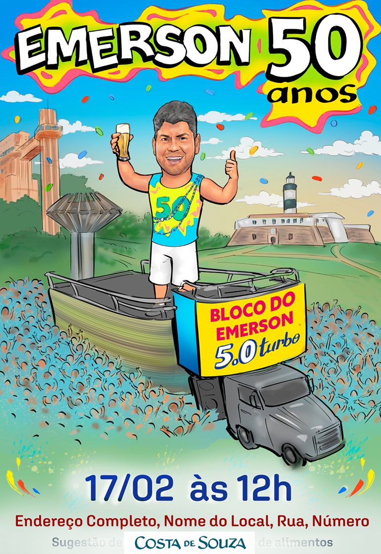 Caricatura para festa de aniversário de 50 anos que aconteceu em Feira de Santana (Bahia), com tema Carnaval de Salvador. Encomenda na opção Colorida, completa.