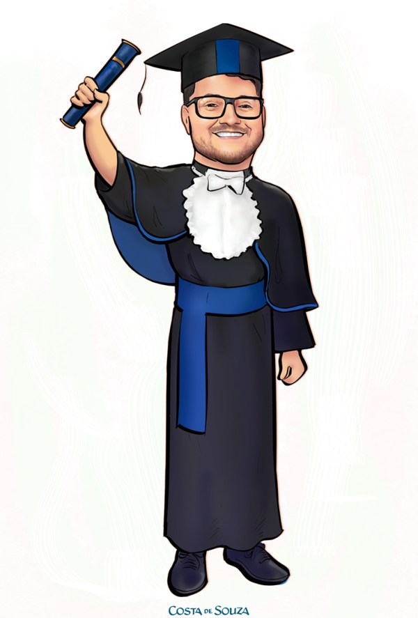 Caricatura para formatura em Engenharia de Produção. Formando com beca, diploma e capelo. Encomenda na opção Colorida, Standard.