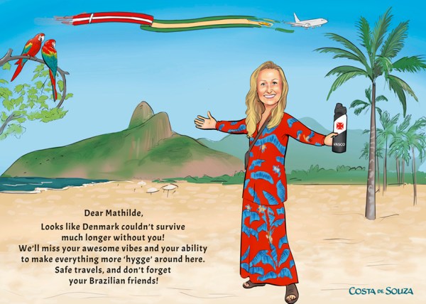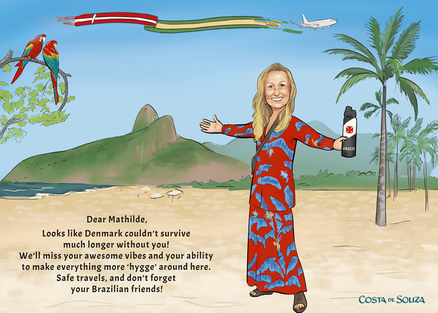 Caricature for a gift as a framed pictured, ordered by the work team for the farewell of the colleague taht´s going back to Denmark. The asked for a very tropical and “carioca” theme.