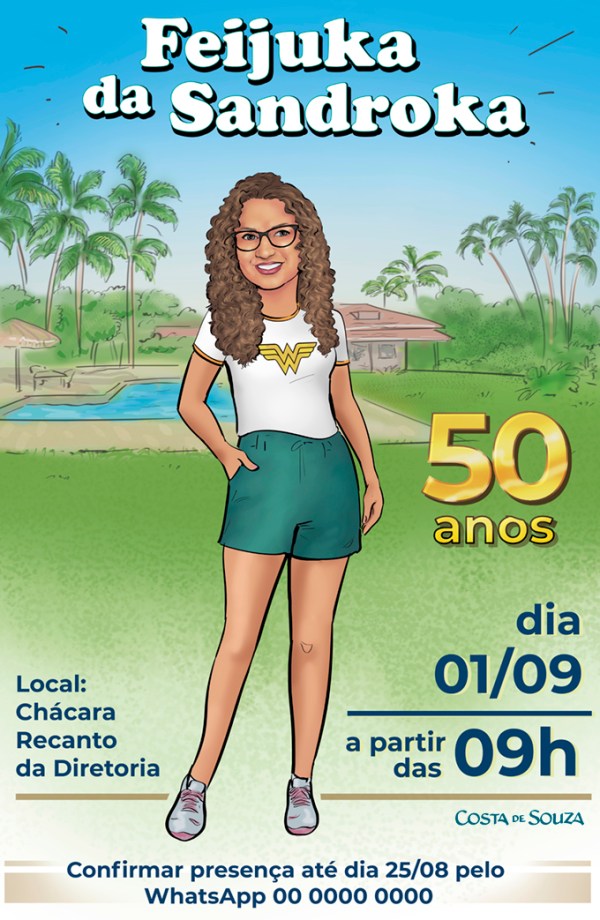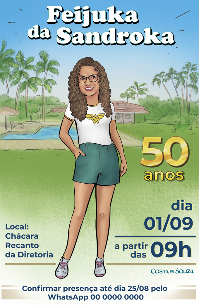 Caricatura e arte do convite para aniversário de 50 anos com tema Feijoada e Piscina. Encomenda na opção Colorida, Completa.