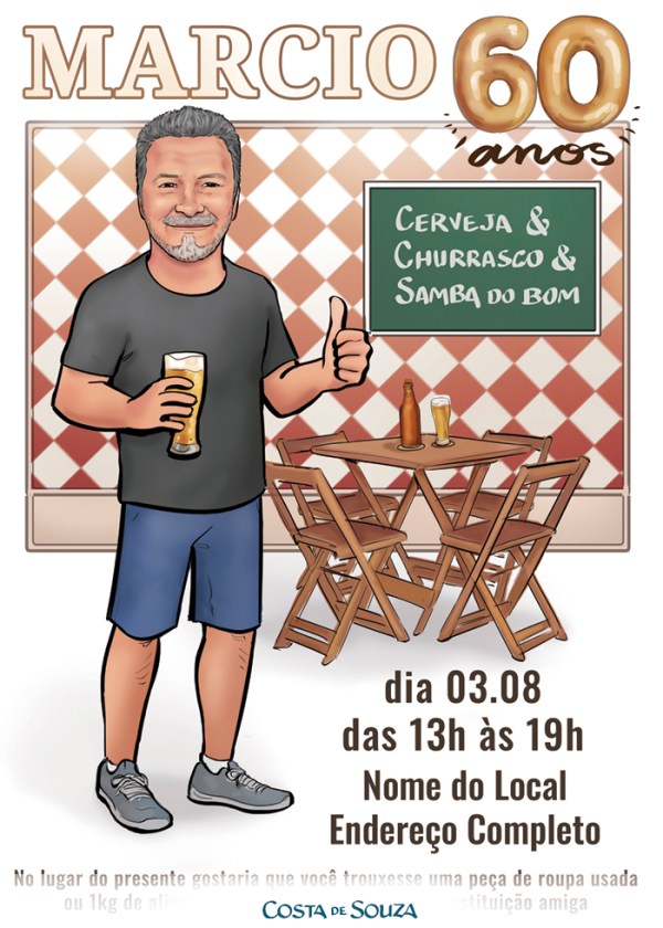 Caricatura e arte do convite para aniversário de 60 anos com tema Boteco. Encomenda na opção Colorida, completa.