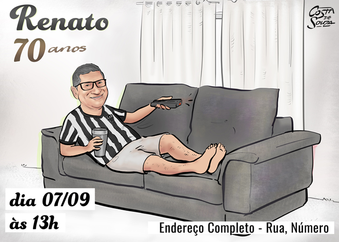 Caricatura e arte do convite para aniversário de 70 anos, para um torcedor do Atlético Mineiro. Encomenda na opção Colorida, completa.