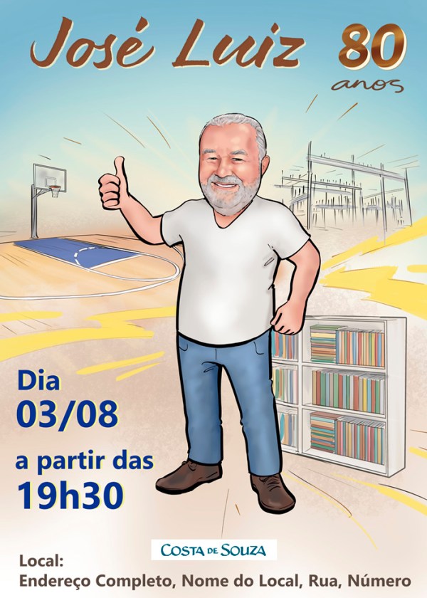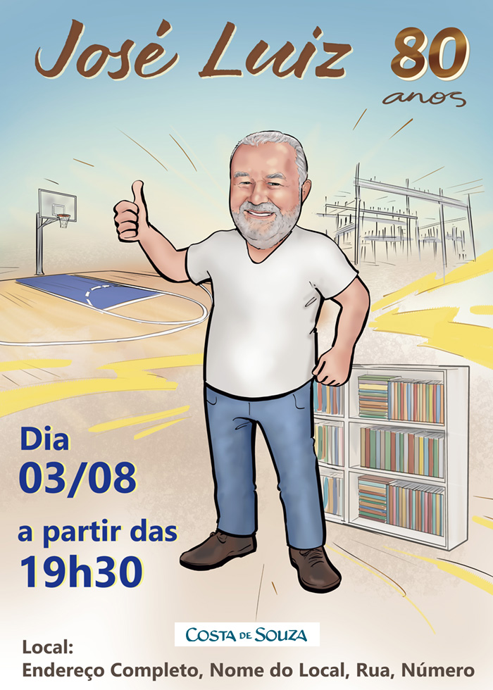 Caricatura e arte do convite para aniversário de 80 anos, para um aniversariante que adora basquete e livros e trabalhou como engenheiro elétrico.