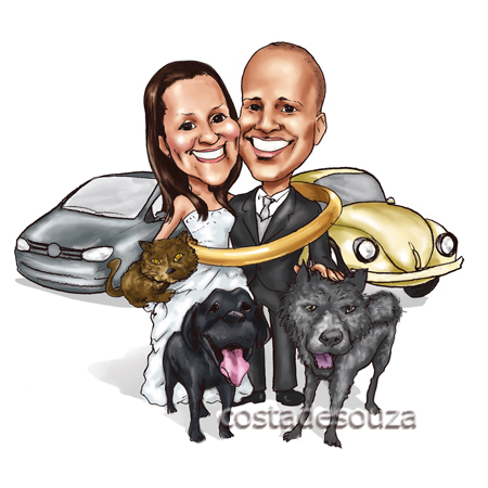 Caricatura para cliente de Blumenau – SC. Modalidade colorida digital, de corpo inteiro, com elementos adicionais. Neste caso, foram inseridos a aliança, os cães, o gato e os carros como itens complementares à caricatura do casal.