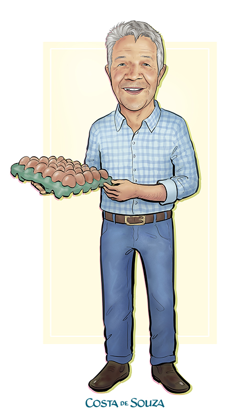 Caricatura por encomenda para festa de aniversário de 70 anos com tema Praia e futevôlei, incluindo também o ônibus do aniversariante.