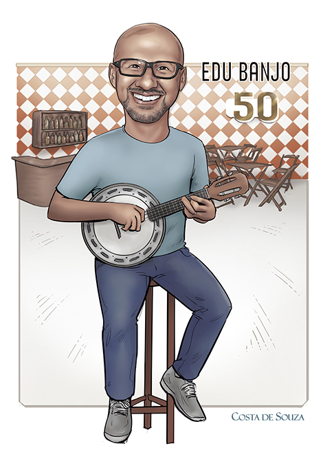 Caricatura para festa de aniversário com tema Boteco, para comemorar os 50 anos de um banjoísta. Encomenda na opção Colorida, completa.