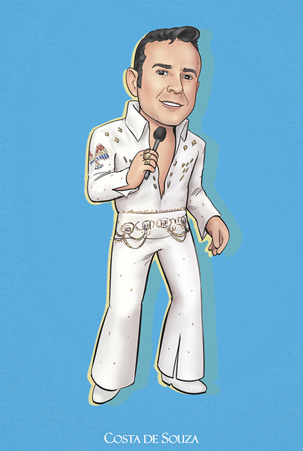 Caricatura para aniversário de 50 anos com tema Elvis Presley. Encomenda na opção Colorida, sem adicionais.