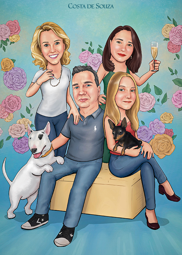 Caricatura de família para quadro em casa. Encomenda na opção Colorida, com 1 adicional. O adicional neste caso é o cachorro.