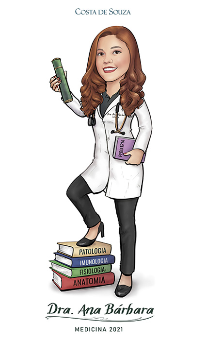 Caricatura para formatura de Medicina. Encomenda na opção Colorida, com 1 adicional. O adicional neste caso foi a escrita de nome e nome do curso.