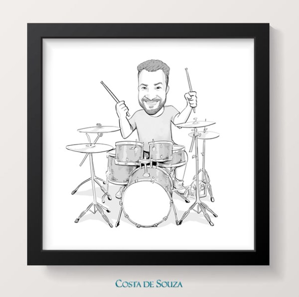 Caricatura por encomenda para presente como quadro. O homenageado adora tocar bateria. Encomenda na opção Em preto-e-branco, completa.