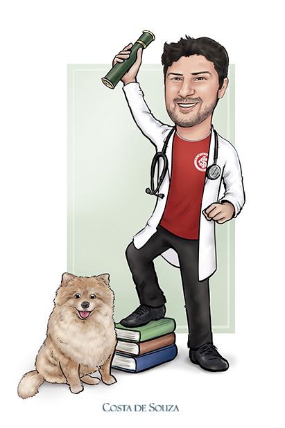 Caricatura para formatura de Medicina. Encomenda na opção Colorida, com 1 adicional. O adicional neste caso foi o cachorro.