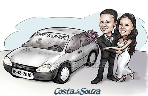 Os clientes pediram que a caricatura tivesse como temas Samba e Bar, em um clima bem animado. Para as frases e as escritas dos sobrenomes foi desenvolvido um lettering em harmonia com a caricatura.
