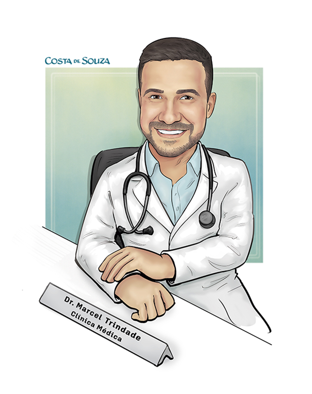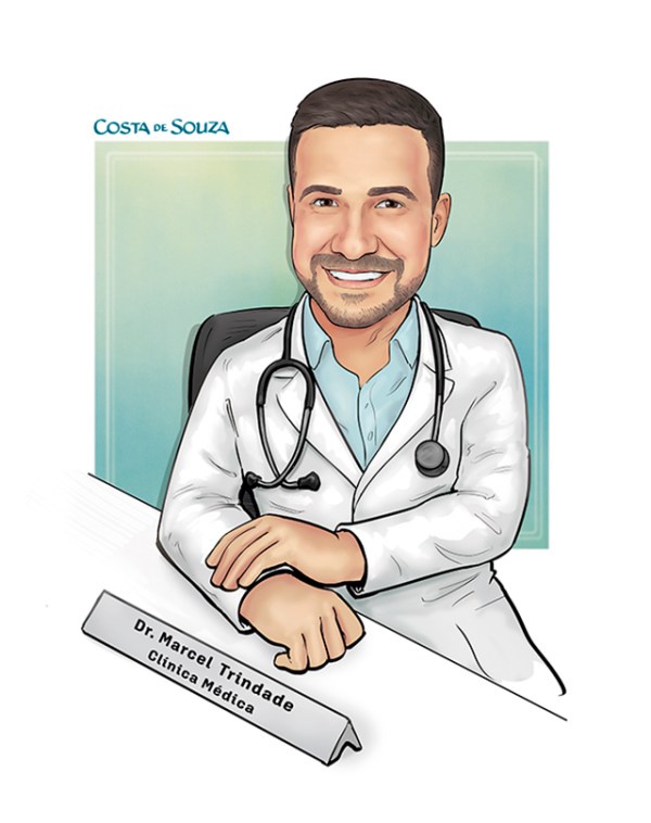 Caricatura para identidade visual profissional de um médico, para uso em diversos materiais de comunicação e marketing. Encomenda na opção Colorida, com adicional. O adicional neste caso foi a placa com escrita do nome.