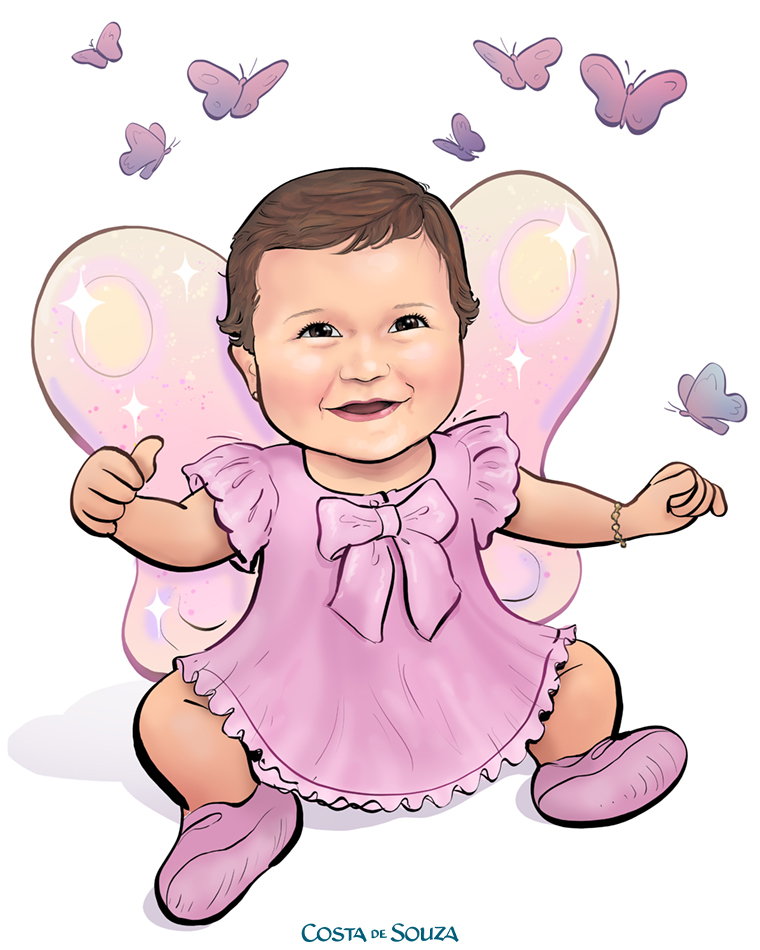 Caricatura por encomenda para homenagem com tema Arquearia. A pessoa homenageada já é adulta, mas o cliente pediu para que ela fosse representada a partir de fotos dela quando criança.