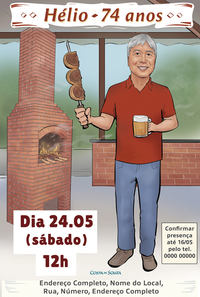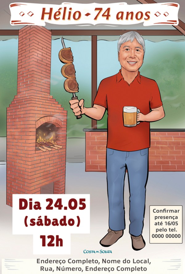 agosto 13, 2025 por Costa de Souza Deixe um comentário Caricatura e design de convite de aniversário com tema Churrasco Caricatura e design de convite personalizado para festa de aniversário com tema Churrasco. Encomenda na opção Colorida, Completa.