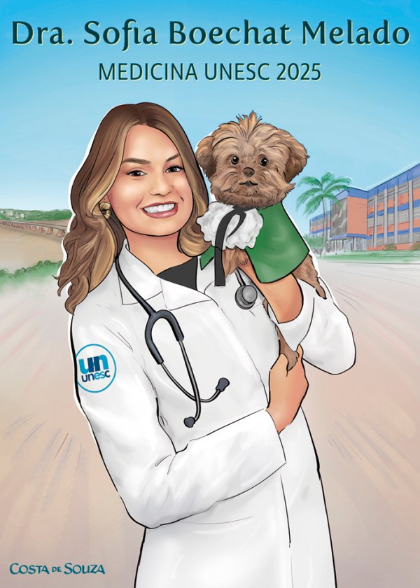 Caricatura para formatura de Medicina. Formanda com seu cachorro e com a universidade e a ponte da cidade de Colatina ao fundo. Encomenda na opção Colorida, Completa.