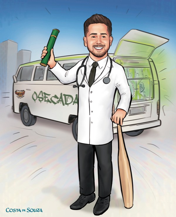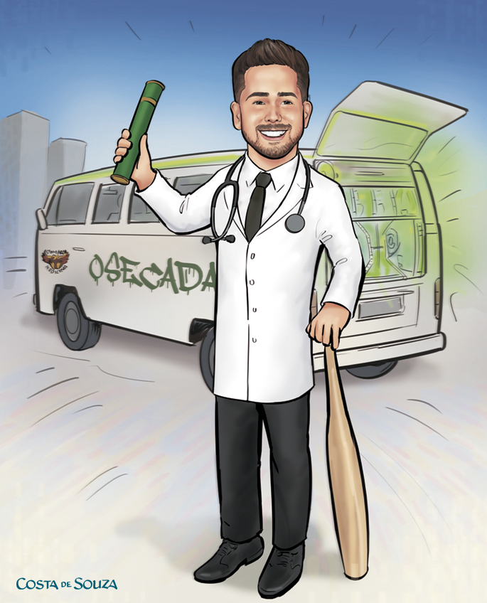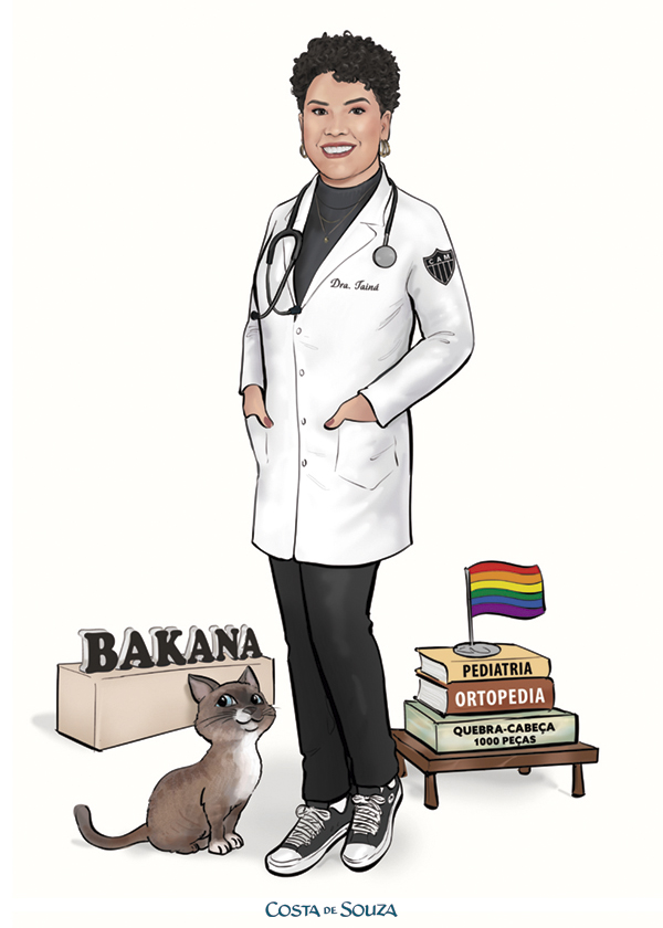 Caricatura para formatura de Medicina. Formanda com jaleco com escudo do Atlético-MG, livros e bandeira LGBTQIA+. O gato que a acompanhou nos estudos não poderia faltar no desenho.