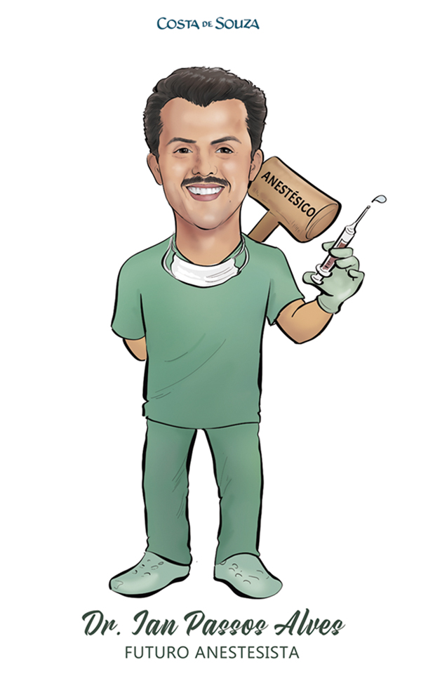 Caricatura para formatura de Medicina. Formanda de jaleco, estetoscópio, livros, e ao lado da sua cachorrinha.