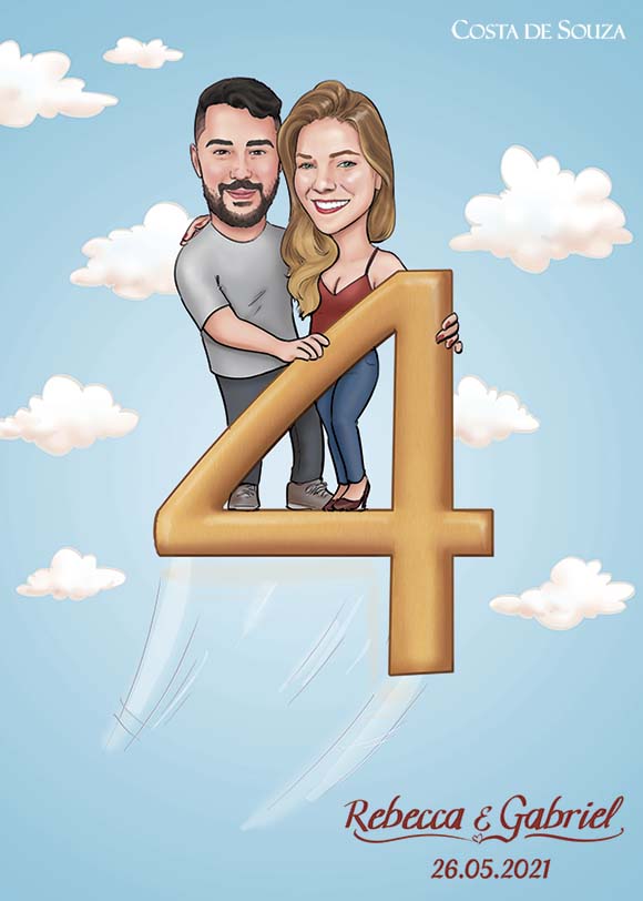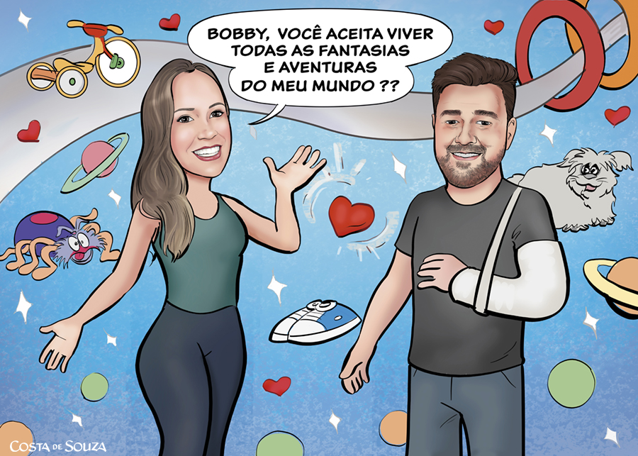Caricatura para presente entre namorados, para pedido de namoro em uma ocasião especial. Ilustração por encomenda na opção Colorida, Completa.