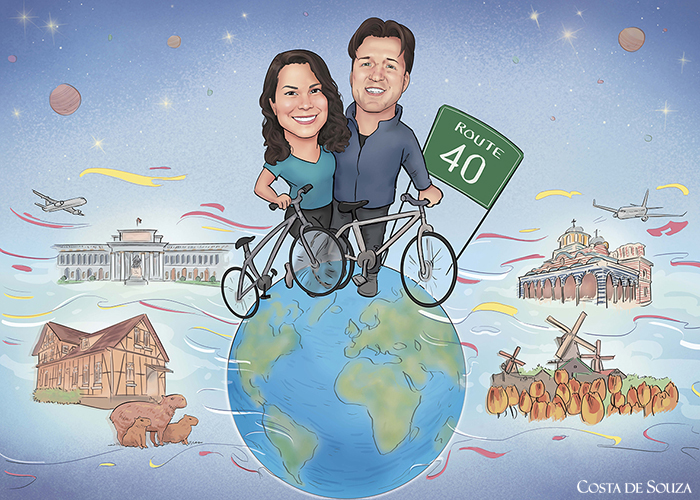 Commissioned caricature for a picture as a birthday gift. The couple loves to travel and ride their bikes. The illustration was meant to include 4 special countries where they used to live: Spain, Bulgaria, Neherlands and Brazil (more specifically, the town where I myself live, Blumenau).