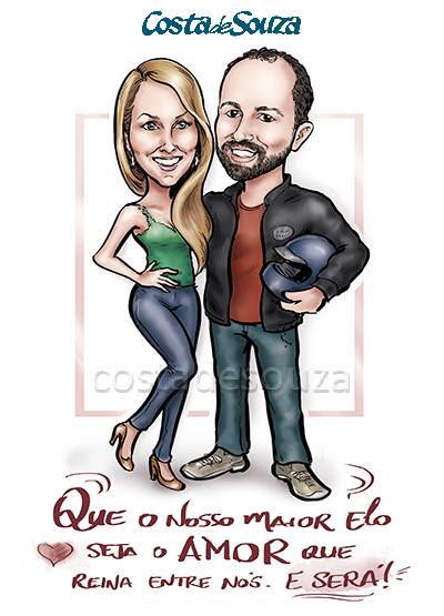 A caricatura de namorados para uso pessoal pode ser aplicada em camiseta, almofada, caneca, copo e também emoldurada como quadro, ou em porta-retrato.
