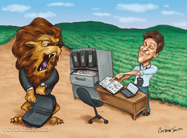 Na ilustração de cima, o perigo do Leão diante de um produtor rural despreparado. Embaixo, a situação do produtor que segue as recomendações dos profissionais da empresa de consultoria contábil.
