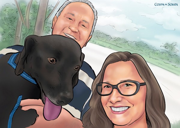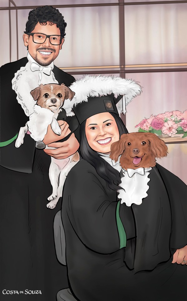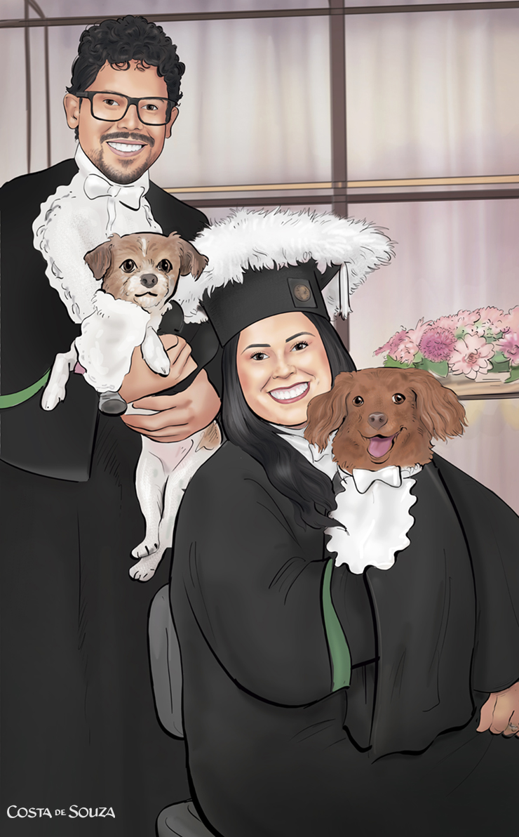 Encomenda para comemorar a formatura, na opção Colorida, Completa, com 2 pessoas e 2 cachorros.