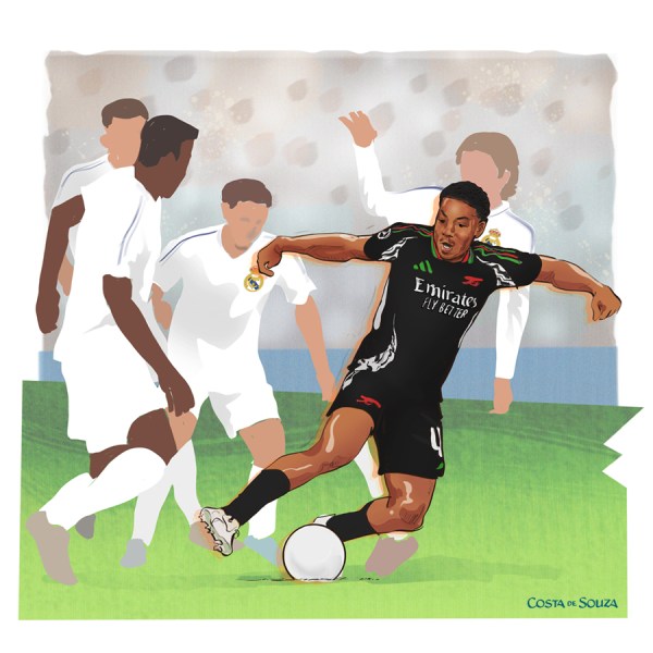 A scene from an unforgettable game last week between Arsenal FC and Real Madrid at the Santiago Bernabeu Stadium, in wich Arsenal won by 2 – 1 with and incredible performance. The Guuners are in to the Semifinal of the Champions League and this guy, Myles Lewis-Skelly played a big part.