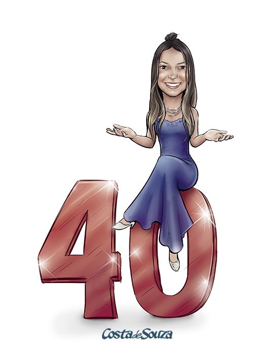 Caricatura para aniversário de 40 anos. Encomenda na opção Colorida, com 1 adicional. O adicional aqui foi a escrita de nome, idade e frase, com desenho personalizado das letras.