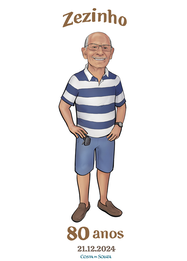 Caricature for an 80th Birthday party with Bar and Flamengo theme. The client ordered this illustration to print it on t-shirts and customized cups. Commission. Colorful, “Complete Scene” option.
