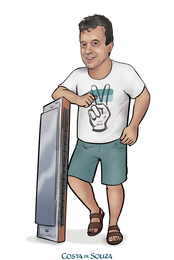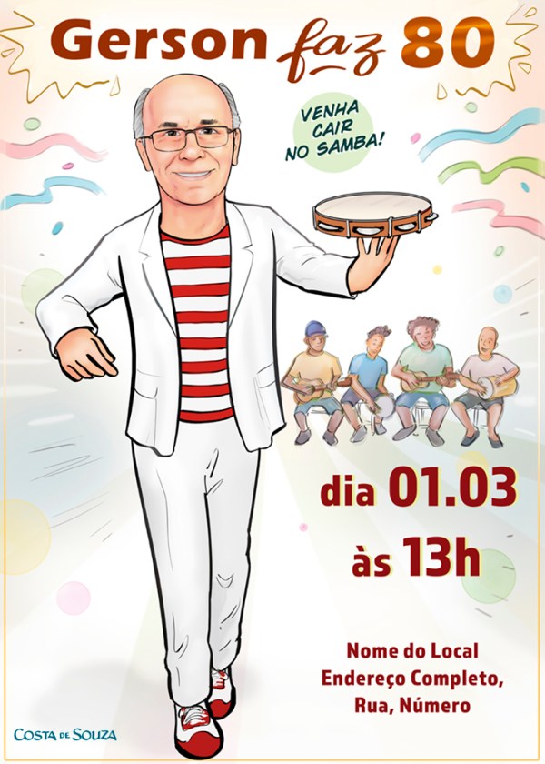 Caricature and invitation card design for a 70th Birthday party with Samba and Bar theme. The birthday man loves to play cavaquinho and is a Botafogo fan.