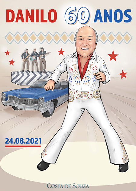 Caricatura para aniversário de 60 anos com tema Elvis. Encomenda na opção Colorida, completa.