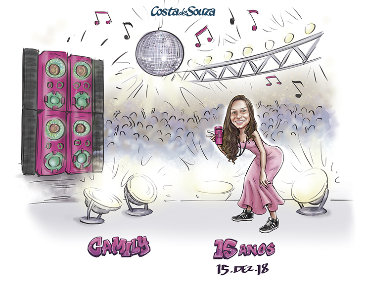 Caricatura para aniversário de 15 anos com tem Balada Funk. A aniversariante adora dançar e a cliente pediu que a cena mostrasse um globo de iluminação e caixas de som grandes na cor rosa.