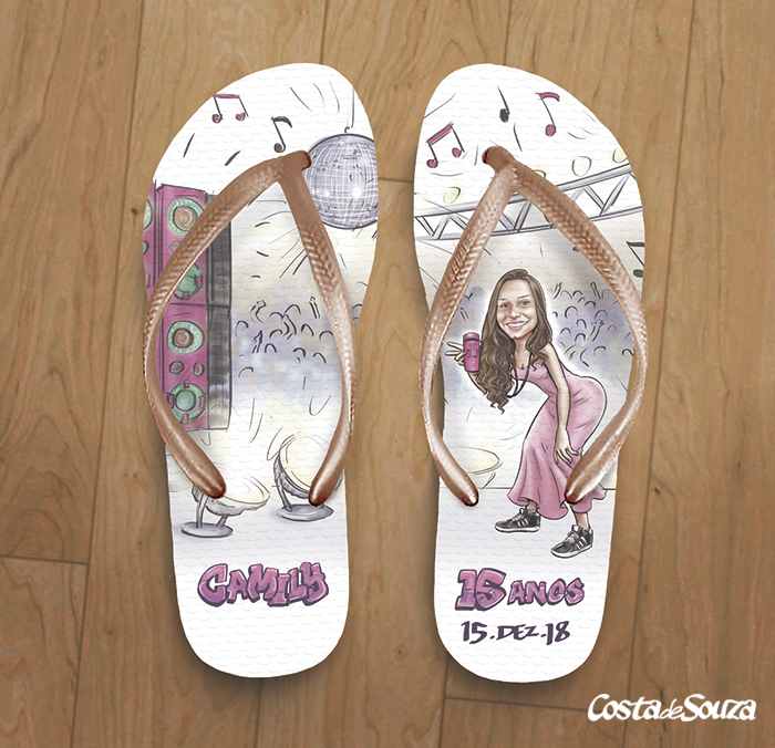 A imagem foi aplicada em chinelos para distribuir aos convidados na festa.
