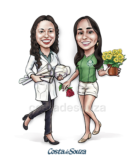 Caricatura de namoradas para presente como quadro. A cliente é farmacêutica e engenheira civil, e pediu que sua companheira estivesse usando uma camisa do Palmeiras e segurando flores.