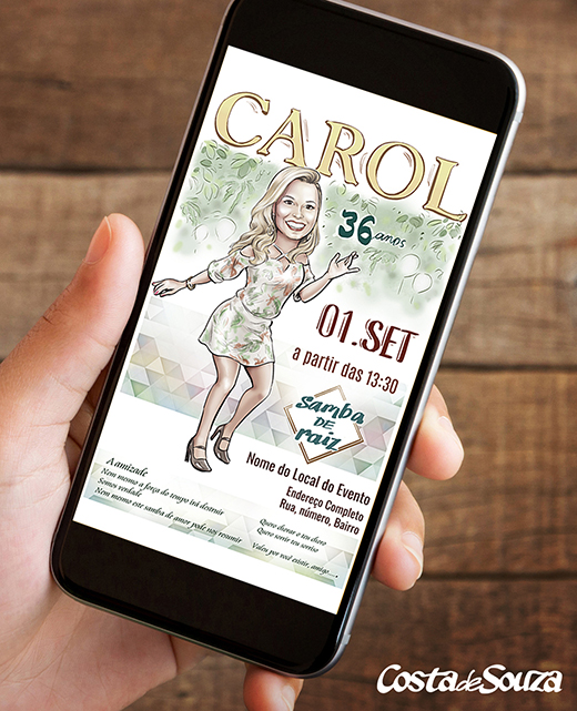 Caricatura e Design para convite de aniversário de 36 anos com tema Samba. Encomenda na opção Colorida, completa.
