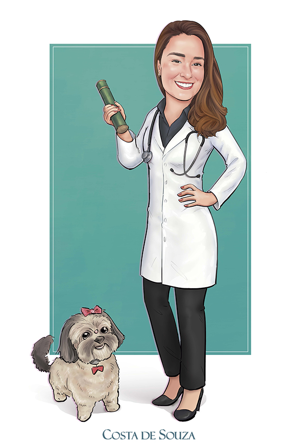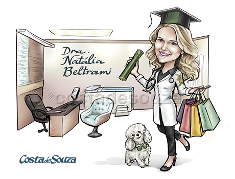 Caricatura para formatura de Medicina. Formanda que adora fazer compras e pediu para estar acompanhada da sua cachorra poodle. Para o cenário, o tema escolhido foi o consultório médico.