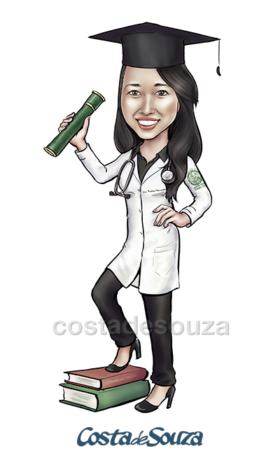 Caricatura para formatura de Medicina para um formando que pretende se especializar em Anestesiologia. Encomenda na opção Colorida, com 1 adicional. O adicional nesse caso foi a escrita de nome e frase.