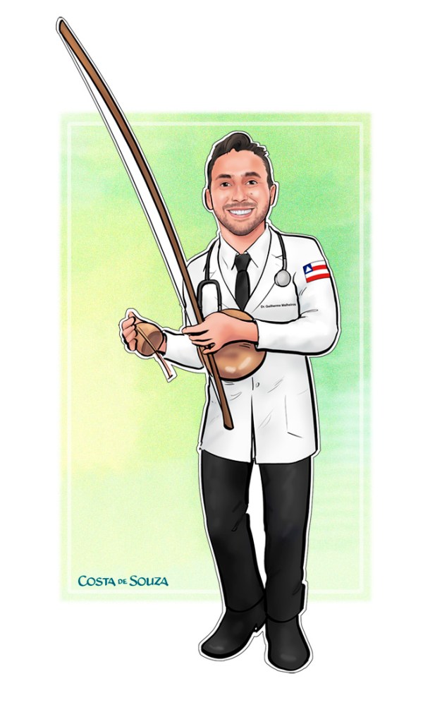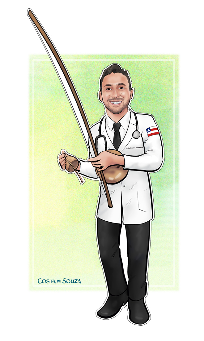 Caricatura para formatura de Medicina. Encomenda na opção Colorida, Standard. Formando de jaleco e com um berimbau.
