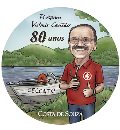 Caricatura para aniversário de 80 anos, com o tema Pesca. O aniversariante é gaúcho e torce pelo Internacional. A cliente pediu que ele fosse mostrado com uma cuia de chimarrão e a camisa do time, além do seu barco de pesca ao fundo.