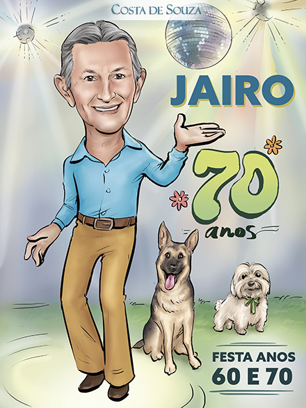 Caricatura para aniversário de 70 anos, com tema Festa Anos 60 e 70. Aniversariante com seus dois cachorros e cenário ao fundo.
