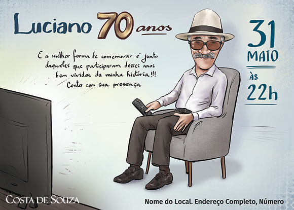 Caricatura e design de convite para aniversário de 70 anos. O aniversariante adora assistir TV na sala, e este foi o tema sugerido pela cliente para a arte.