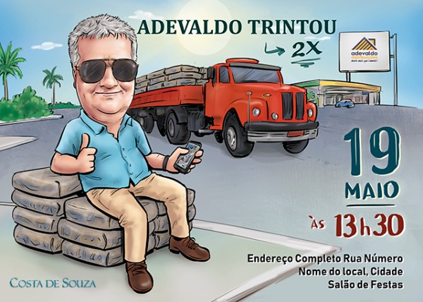 Caricatura para aniversário de 60 anos. O aniversariante adora viajar de caminhão e transporta cimento para sua empresa. Os clientes pediram para aproveitar este tema no convite, com a frase “Adevaldo trintou 2 vezes”.
