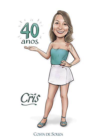 Caricatura para aniversário de 40 anos. Encomenda na opção Colorida, com 1 adicional. Neste caso, o adicional foi o desenvolvimento do lettering para o nome e idade, em harmonia com a caricatura.