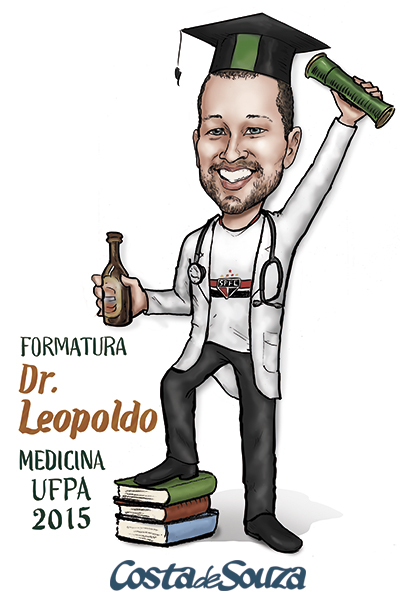 Caricatura para formatura de Medicina. Formando com livros e com desenho personalizado do nome.