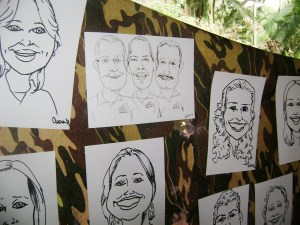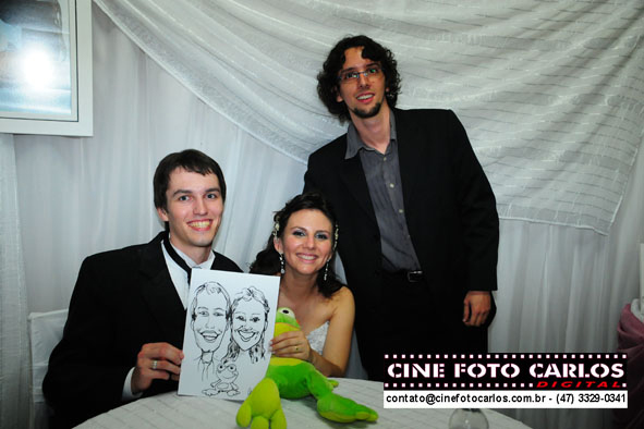 Caricatura para banner com espaço vazado para os convidados tirarem fotos na festa. Esta caricatura foi feita para um casal de Blumenau, que recebeu também um arquivo digital com a caricatura apenas dos noivos, na mesma pose, porém sem os convidados ao lado. Uma alternativa para usar a arte da caricatura no convite, em quadro, lembranças, na internet e também na forma de uma brincadeira na entrada da festa.